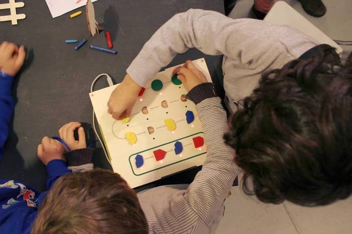 Matteo Loglio, projetista de interação criativa, criou essa ferramenta lúdica para permitir que as crianças conduzam um pequeno robô usando a lógica e um painel de madeira com peças de encaixar.